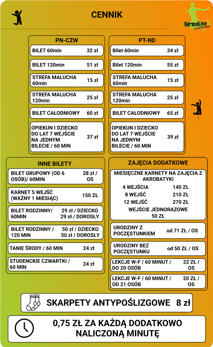 To tylko u nas w Adrenalinie Parku Trampolin. Zaproś swoich gości, zarezerwuj termin i masz zapewnione super urodziny. Pobawisz się ze Swoimi gośćmi na trampolinach pod bacznym okiem trenera, a my zadbamy o napoje, poczęstunek, tort i niezapomniane wrażenia dla Ciebie i Twoich gości. Od 50zł od uczestnika za 120 minut super odlotowej zabawy. Jubilat dostaje od nas prezent niespodziankę! Istnieje możliwość rezerwacji urodzin z poczęstunkiem w cenie od 71 zł od uczestnika.
